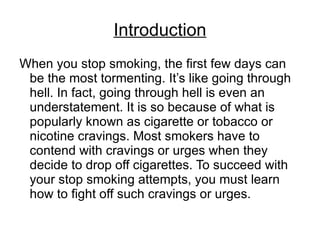 This document provides information about nicotine cravings when quitting smoking. It discusses that there are two types of cravings - psychological and physical. Psychological cravings are triggered by habits associated with smoking, while physical cravings are the body's reaction to nicotine withdrawal. Nicotine causes cravings by stimulating the brain's pleasure centers. Cravings typically last 3-5 minutes. Ways to handle cravings include drinking water, exercise, distracting activities, and reminding yourself of reasons for quitting. Nicotine replacement therapy can also help reduce craving symptoms.