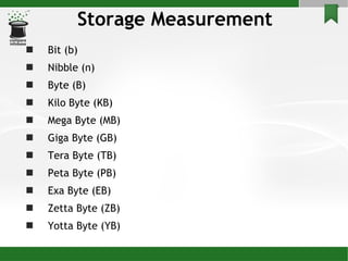 Storage devices can be categorized by their storage characteristics, capacity, and interface. Common storage devices include magnetic disks like hard disks, optical disks like CDs and DVDs, tape storage, and flash memory. Larger storage systems for organizations use storage area networks that connect servers to high-capacity storage devices over fiber channels, providing redundancy, backup capabilities, and high performance.