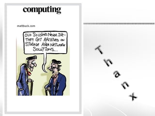 The document presents an overview of Storage Area Networks (SAN), emphasizing their architecture, security standards, and best practices. It highlights the business need for SANs, their cost-effectiveness, and the growing complexity of security in storage networks which need to address data protection legislation. Additionally, it outlines IP SAN and Fibre Channel security measures, along with organizations and standards involved in SAN technology.
