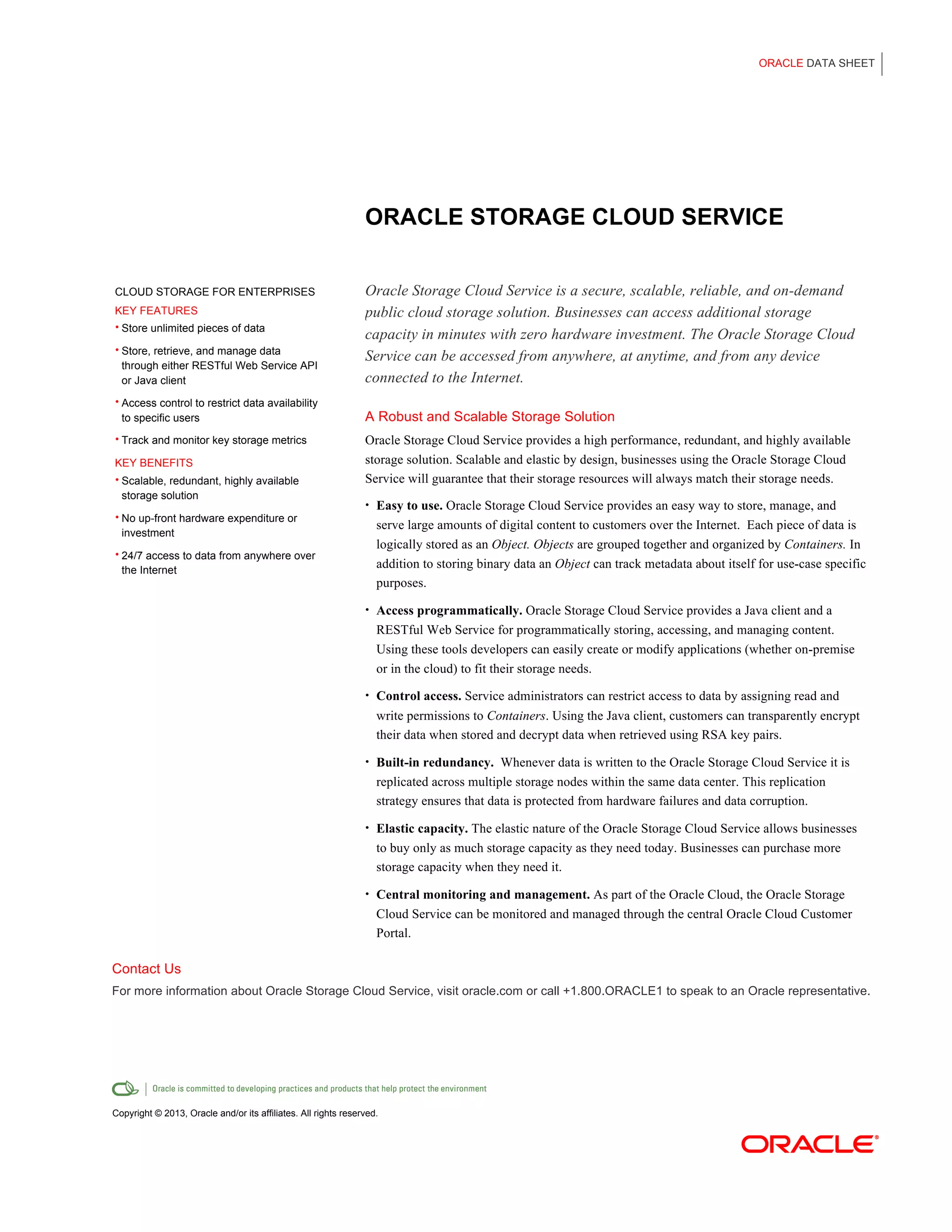 The Oracle Storage Cloud Service is a scalable, redundant cloud storage solution that allows businesses to store unlimited data with no upfront hardware costs. It provides programmatic access via RESTful API or Java client. Data is accessible from anywhere via the internet and access controls can restrict data availability. The storage automatically scales to match business needs and is monitored through the Oracle Cloud Customer Portal.
