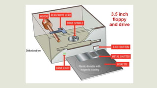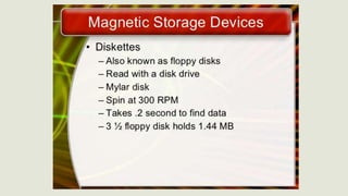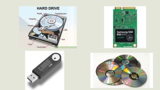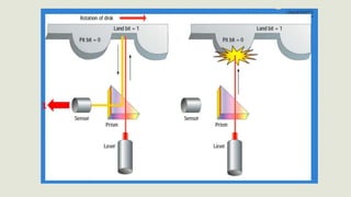 This document discusses different types of storage devices including optical storage devices. It provides a brief history of optical storage including the introduction of CDs in 1983, DVDs in 1996, and Blu-Ray in 2002. It describes how optical storage works by making marks on an optically readable medium that can be read back with a laser, and how data is stored in pits and lands. The document also outlines other storage devices like hard drives, solid state drives, flash memory, and magnetic storage devices.