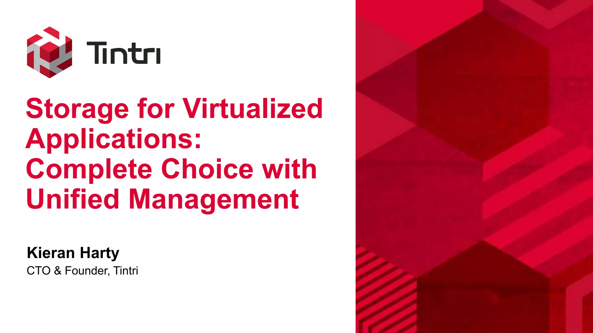 Kieran Harty from Tintri presents on Tintri's new storage products for virtualized applications. Tintri introduces the T5000 all-flash array series for high performance workloads. Tintri OS 4.0 provides VM-level quality of service and data management across Tintri's hybrid-flash and all-flash systems. Tintri Global Center 2.1 allows unified management of over 100,000 VMs across multiple storage nodes. Tintri also introduces VMstack converged infrastructure for packaging Tintri storage with servers and networking.