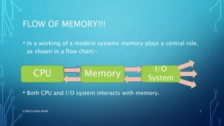 This document discusses different approaches to memory management in computer systems. It explains that memory plays a central role, with the CPU and I/O system interacting with memory. It then describes four approaches to memory allocation and management: contiguous storage allocation, non-contiguous storage allocation, virtual storage using paging, and virtual storage using segmentation. Paging divides memory into fixed-size frames and logical memory into same-sized pages, using a page table to map logical to physical addresses. Segmentation divides a program into variable-sized segments and uses a segment table to map two-dimensional physical addresses. The most efficient approach sometimes combines paging and segmentation.