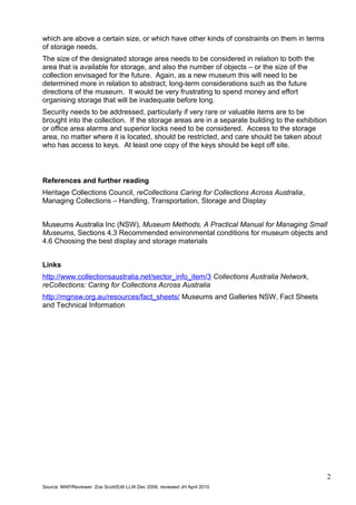 Several key principles should be considered when setting up a storage area for a museum collection. Storage areas should allow for easy access to collection objects and adequate space so shelves are not crowded. Appropriate materials should be used and objects should be oriented and grouped together by collection type or media. This organization allows environmental conditions to be addressed specifically for different object types. The size of both the storage area and growing collection should also be considered to ensure space is utilized efficiently and remains adequate over time. Security is important as well, especially for valuable items.