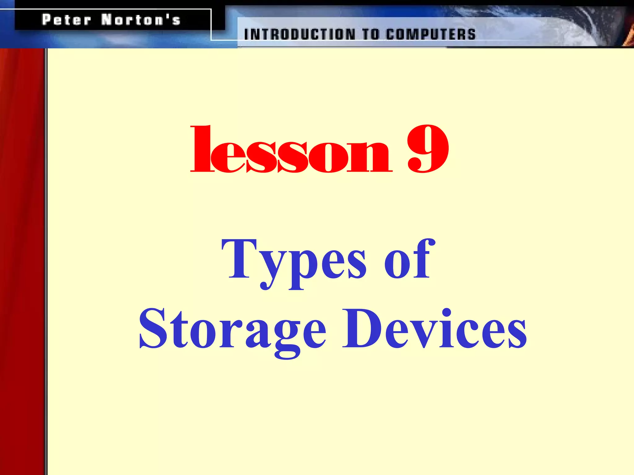 This document discusses different types of storage devices, categorizing them as magnetic or optical. Magnetic storage devices include floppy disks, hard disks, and magnetic tape. Optical storage devices include CD-ROM, DVD-ROM, CD-R, and CD-RW. The document explains how data is stored on magnetic disks using polarized particles and on optical disks using pits and lands that reflect light differently. It provides details on formatting disks and the areas created, capacities of different devices, and speeds of CD-ROM and DVD drives.