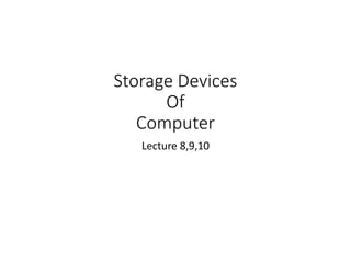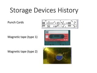This document discusses various computer storage devices. It begins by defining basic units of storage like bits, bytes, kilobytes, megabytes, etc. It then describes different types of primary storage devices like RAM and ROM as well as secondary storage devices like hard disks, CDs, DVDs, flash memory, and magnetic tapes. Specific storage devices are then discussed in more detail including hard disks, optical discs, magnetic disks, disk caches, and various memory cards. The document concludes by covering other older storage technologies like zip disks and super disks.