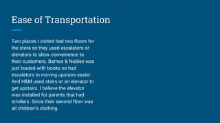- Barnes & Noble and H&M both had two floors, with escalators or elevators to aid customer access between floors.