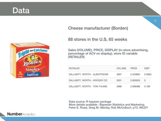 This document describes how a cheese manufacturer (Borden) can allocate their marketing resources like display advertising and price discounts across 88 retailer stores. It recommends using a Bayesian demand model to estimate demand parameters at the store level to overcome limitations of individual store analysis. The model finds most stores have a price elasticity around -0.954, meaning a 10% price decrease increases sales by 9.54% on average. It also estimates how much increasing display coverage to 100% would increase sales 462.94% on average. The document advises prioritizing display budgets for stores with high estimated display lift and price discounts for stores with high price elasticity.
