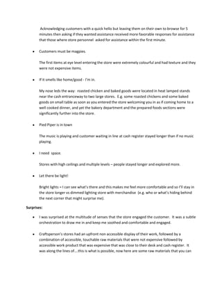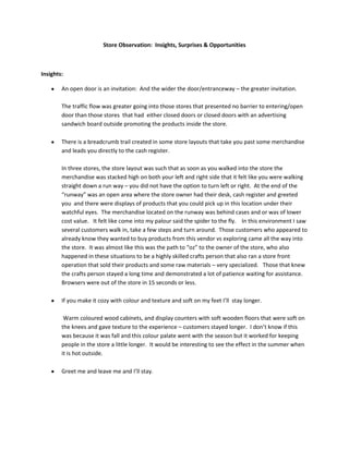 The document provides insights, surprises and opportunities observed from store visits. Some key insights include that open entrances invite customers inside, layouts that guide customers past merchandise to the cash register are effective, and warm colors and soft surfaces encourage longer browsing. It was surprising how stores engaged multiple senses to keep customers comfortable. Craft stores displayed raw materials and less expensive items before more expensive finished products. Opportunities include providing coat storage, an open work table for craft materials, editing merchandise displays, changing colors seasonally, and using appropriate scents.