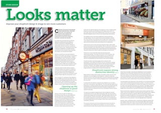 The document discusses the importance of storefront design for small retail stores. It notes that creating a strong visual brand identity through elements like signage, color schemes, and window displays is essential for attracting customers. It provides examples of well-designed storefronts internationally and discusses strategies independent Australian stores can use to differentiate themselves and compete against larger chains. Experts recommend shopfront designs that create a distinctive identity, allow visibility into the store, and balance illumination to attract customers.