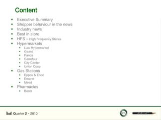 This document provides an overview of retail industry news and best practices from the second quarter of 2010. It notes that many brands capitalized on "World Cup mania" by bringing football/soccer themes into their store displays. The document also summarizes several retail industry news stories, including new store openings, expansions, and product launches. Examples of innovative in-store displays from various retailers are highlighted, with a focus on leveraging current events or using distinctive design elements.
