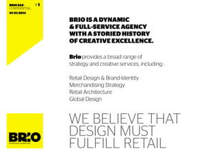 Brio is a full-service retail design agency with a storied history of creative excellence. They provide strategic and creative services including retail design, branding, merchandising, and architecture. Brio believes design must fulfill the needs of retailers and consumers. They offer creative solutions to develop brands, increase sales, and improve the customer experience. Brio works as a consultancy, creative agency, and merchandising agency with clients across many industries.