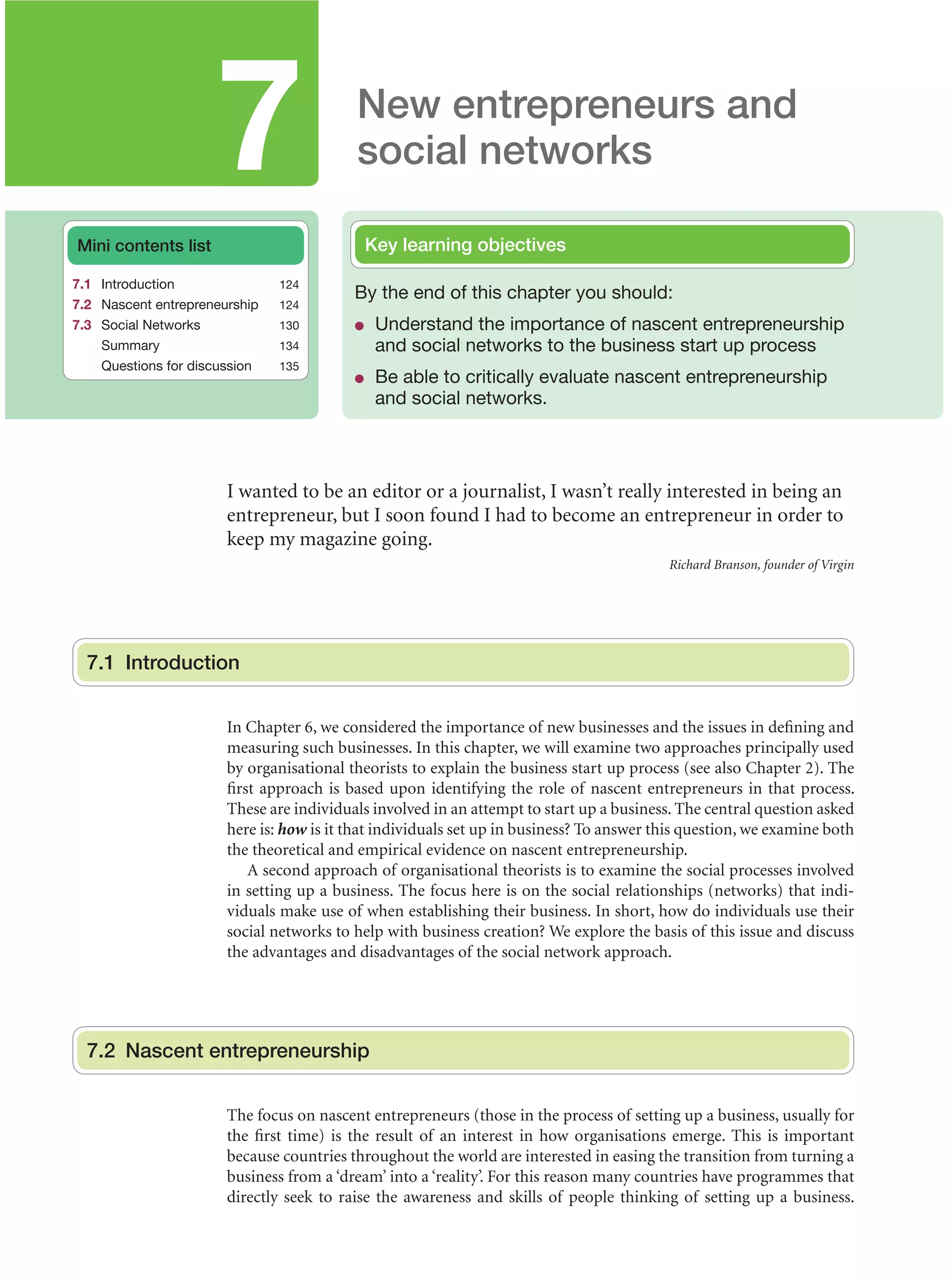 This chapter discusses two approaches used to explain the business startup process - nascent entrepreneurship and social networks.