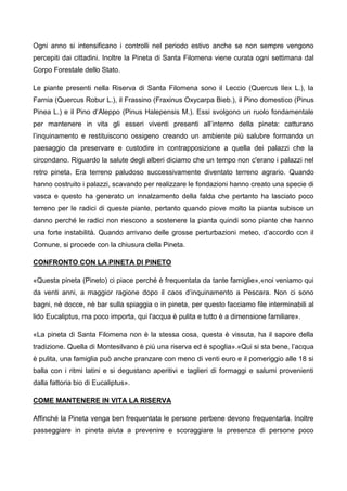 La pineta di Santa Filomena, impiantata tra il 1927 e il 1930, è diventata riserva naturale nel 1977 per proteggere un ecosistema di circa 10.000 alberi nella zona di Pescara e Montesilvano. Attualmente offre attività ricreative come trekking e pic-nic, ma presenta sfide di manutenzione e sicurezza a causa di comportamenti scorretti dei visitatori. Gli abitanti e le autorità locali sono incoraggiati a collaborare per preservare la pineta attraverso azioni di tutela e sensibilizzazione.