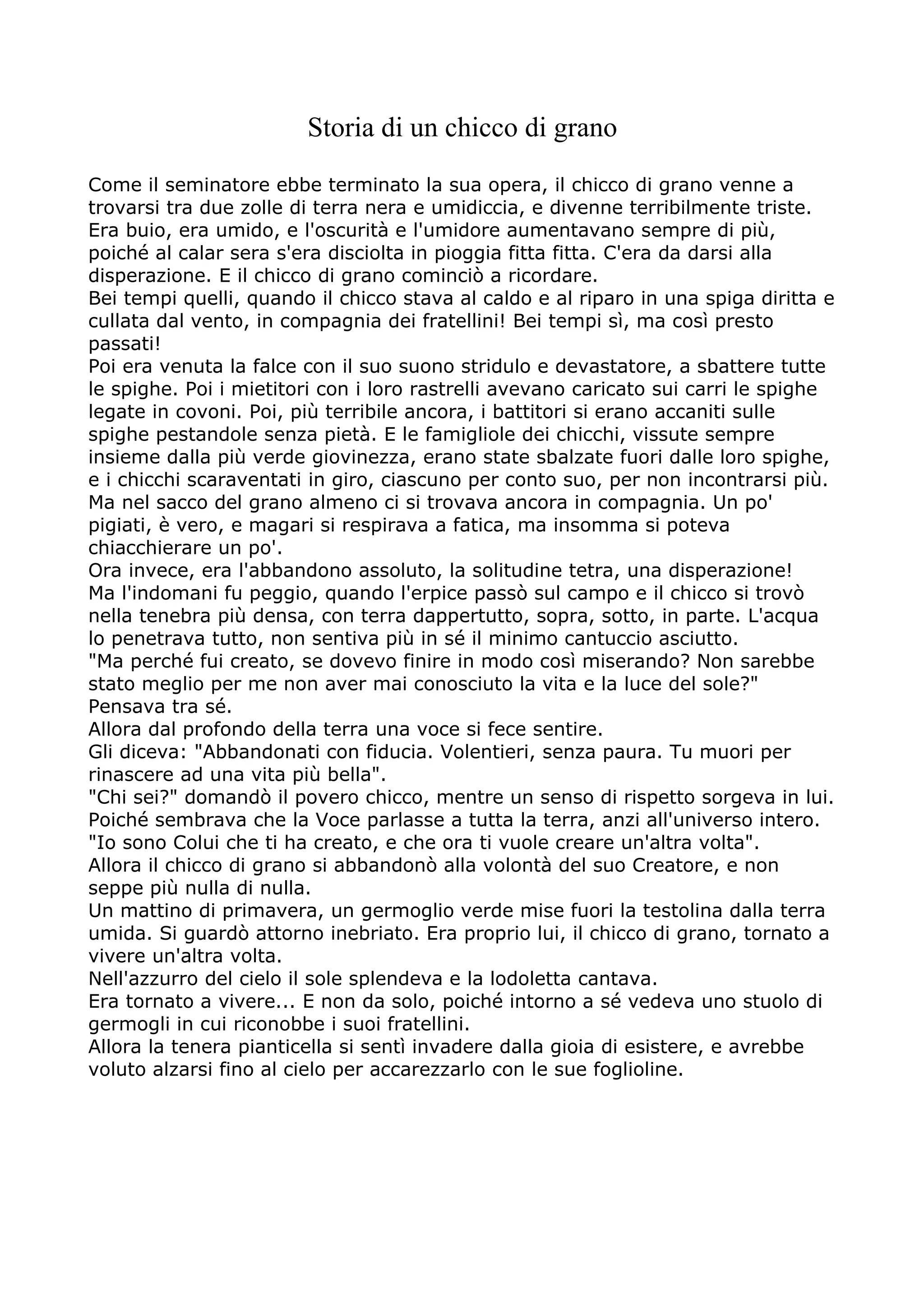 Il documento narra la storia di un chicco di grano che, inizialmente triste e solo dopo la raccolta, trova conforto nella voce della sua creazione che gli promette una nuova vita. Dopo aver accettato il suo destino, il chicco germoglia e si riunisce con i suoi fratelli sotto il sole. Infine, la storia si conclude con l'importanza della fiducia in Madre Terra, che protegge e nutre i chicchi durante il loro sviluppo.