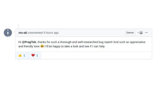 The document discusses various topics related to open source software including welcoming and helping users, releasing software early and often, treating open source software as a hobby rather than work, using micro libraries, benchmarking code performance, learning as you go, co-maintaining projects, reporting and fixing issues, being polite, discussing ideas for improvements, considering how software may be used, making open source more diverse and sustainable, and enjoying participating in open source projects.