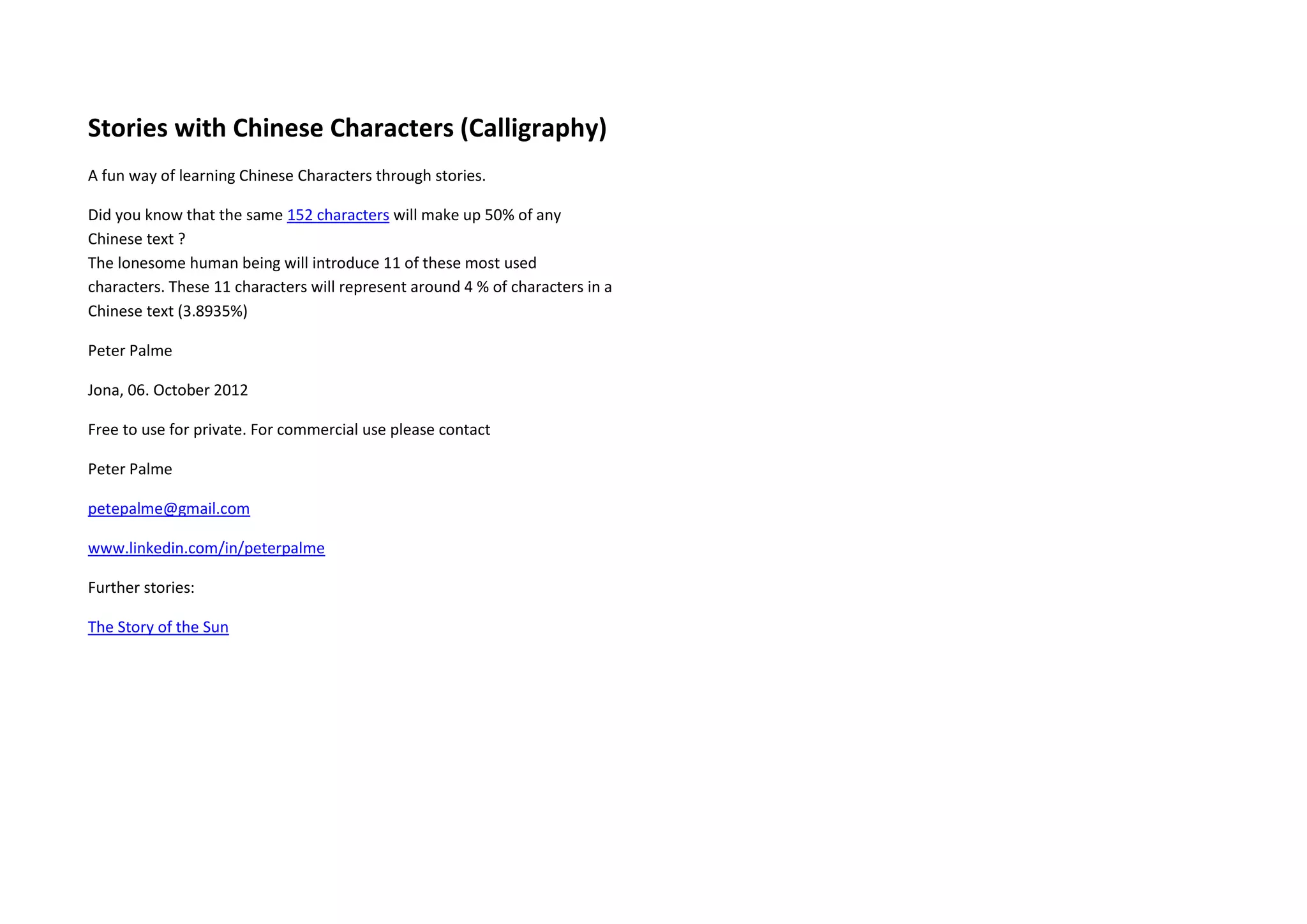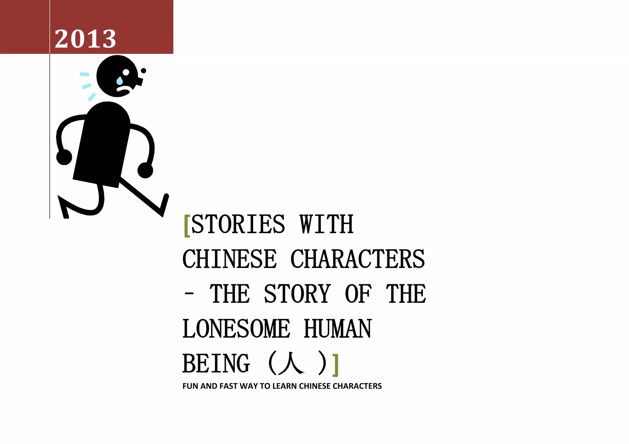 The document presents a creative story aimed at helping learners acquire Chinese characters through narrative. It introduces 11 commonly used characters, using the tale of a lonesome human being who ultimately finds companionship. Key characters and their meanings are integrated within the story to facilitate understanding and memorization.