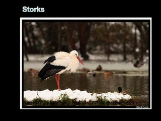 This document provides instructions for teachers using a slide presentation about storks. It notes that the stork gallery slides will move automatically unless the teacher chooses to move them. It also mentions that the images are from Flickr and their copyrights were preserved, and instructs teachers to move the music icon if they delete one of the slides to keep the music. It then provides background information about storks in folklore before introducing a story about storks.