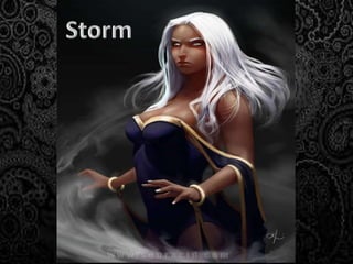 Storm was originally conceived as a male character but became a female character known for her white hair and Mohawk hairstyle, which creators feared would be made fun of. She has appeared in many Marvel animated series and is one of the most powerful superheroes in the Marvel universe, able to control weather. Her name means "Beautiful" in her native language.
