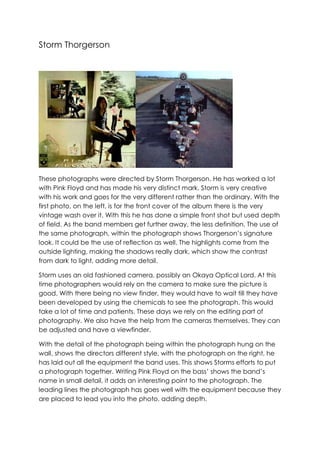 Storm Thorgerson is a creative photographer known for his work with Pink Floyd. He takes unusual approaches that are distinct from ordinary photography. One photo for a Pink Floyd album cover uses depth of field so band members further away are less defined. It also features a photo within the photo, showing Thorgerson's signature style. Another photo lays out the band's instruments and equipment in an interesting composition, with details like "Pink Floyd" written on the bass to add interest without making the band the main focus. Thorgerson's experimental styles produce unique, visually engaging photos.