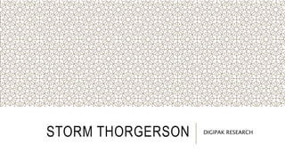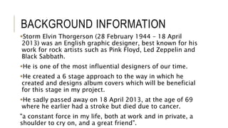 Storm Thorgerson was an influential English graphic designer best known for his album cover art for Pink Floyd, Led Zeppelin, and Black Sabbath. He developed a 6-stage process for creating album covers that involved meeting with artists to discuss ideas, developing rough concepts, creating prototypes for feedback, photographing models and locations for the shoot, editing the photos in post-production, and finalizing the artwork for approval. Thorgerson passed away in 2013 at age 69 and was praised for his creative contributions and friendship.