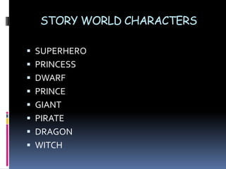 This story features common fantasy characters including a superhero, princess, dwarf, prince, giant, pirate, dragon, and witch. The characters embark on a boat trip that concludes their tale.