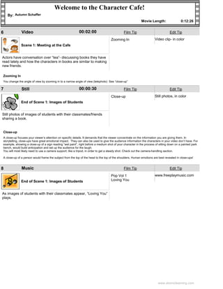 The document is an instructional video about a Character Cafe that introduces children to characters from books. It contains tips for filming techniques like establishing shots, close-ups, medium shots, and zooming. The video shows scenes of children at a cafe discussing book characters they relate to and how characters are like making new friends. It encourages children to imagine how they can "be a character" by dressing like characters from stories.