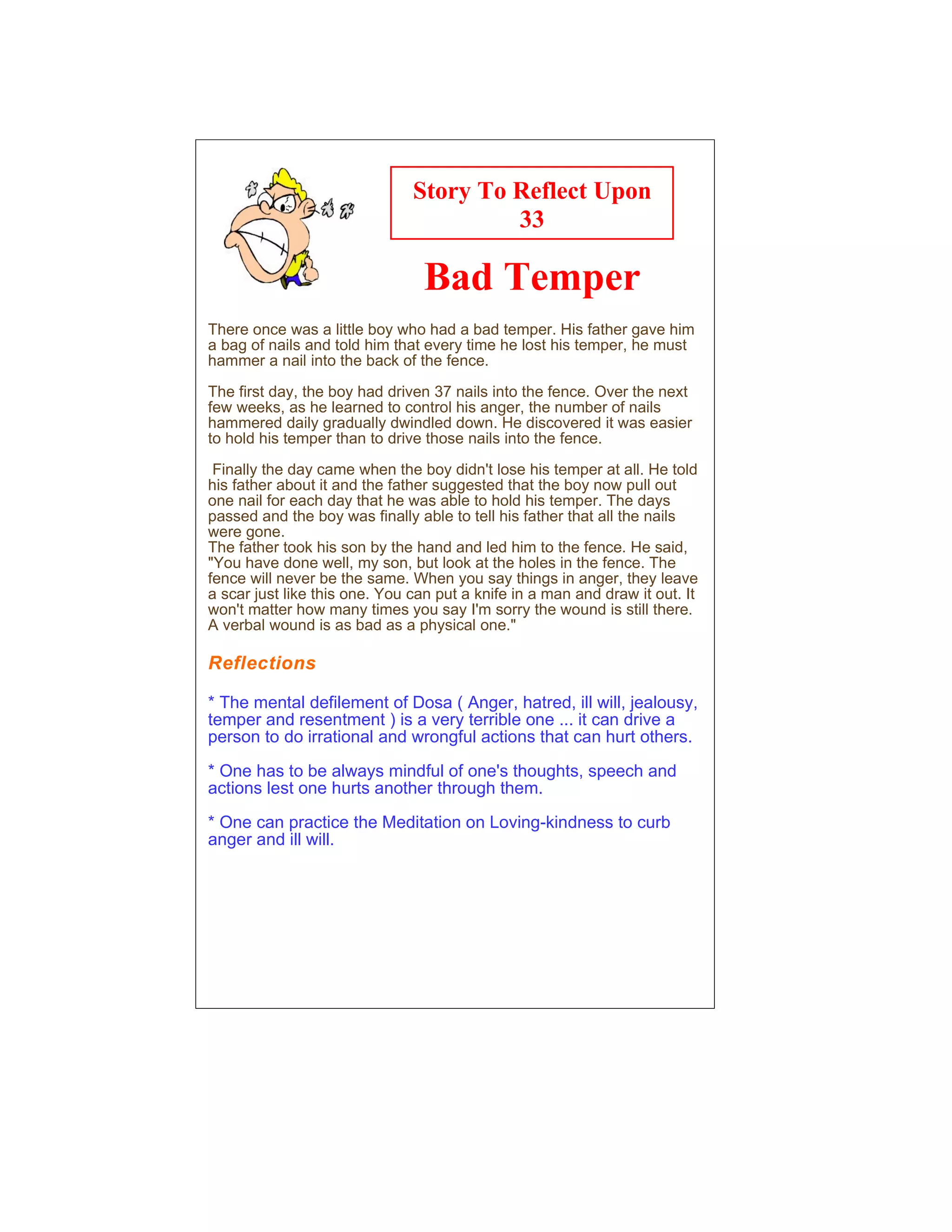 The document tells a story about a little boy who had a bad temper. His father gave him nails and told him to hammer one in the fence every time he lost his temper. Over several weeks, as the boy learned to control his anger, he hammered fewer nails each day. When he went one day without losing his temper, his father had him start pulling out nails. Eventually, all the nails were gone. However, the father showed the boy the holes still in the fence, saying angry words leave scars like the holes, even if you apologize.