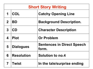 The document outlines seven steps to write a short story: 1) include a catchy opening line, 2) add background description, 3) include a character description, 4) develop the plot, 5) include dialogues in direct speech form, 6) write the resolution, and 7) add a twist or surprise ending. It then provides an example short story following these seven steps, where a boy hears a strange sound on his way home through a dark pathway, encounters his grandfather who leads him home, and later learns that his grandfather had died that morning.