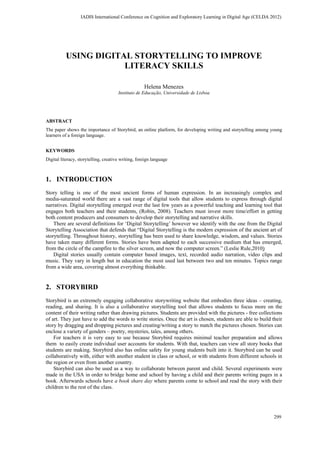 The document discusses using the online platform Storybird to improve literacy skills through digital storytelling. Storybird allows students to write stories by dragging and dropping pictures onto pages and adding text. Teachers had students in different classes and schools collaborate on stories using Storybird. This encouraged writing, reading, and literacy skills. Storybird also helped reluctant writers and engaged young students. It promoted creativity, imagination, and literacy.