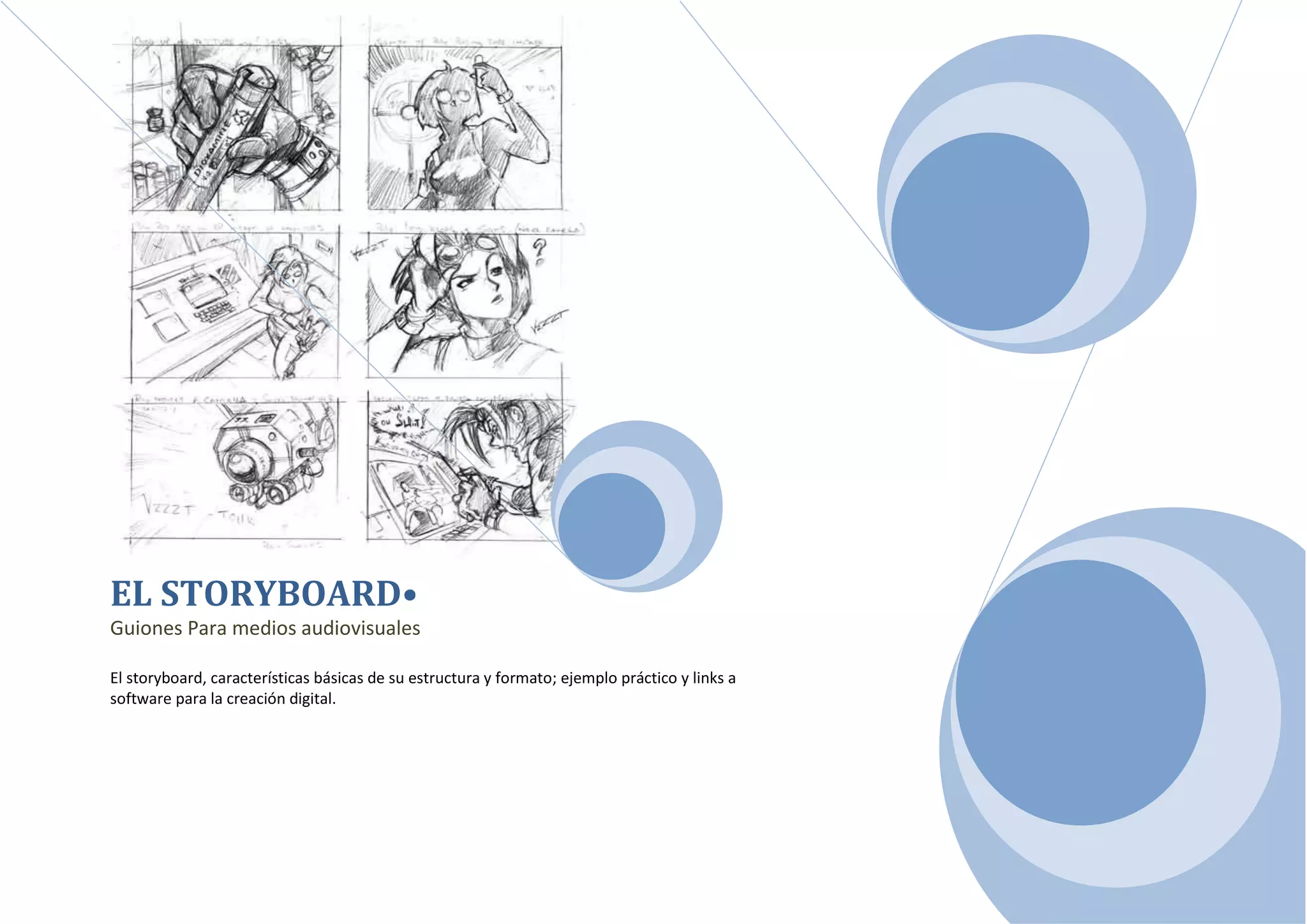 El storyboard es una herramienta útil para la elaboración de guiones audiovisuales. Consiste en una serie de dibujos ordenados en secuencia que visualizan las acciones de cada escena. El storyboard ayuda a planificar las ideas del guionista y a determinar cómo se traducirán las escenas en imágenes. Debe incluir viñetas con las imágenes clave de cada escena, así como información sobre la acción, diálogo y transiciones. Su propósito es facilitar la visualización de la historia a través de imágenes en secuencia.