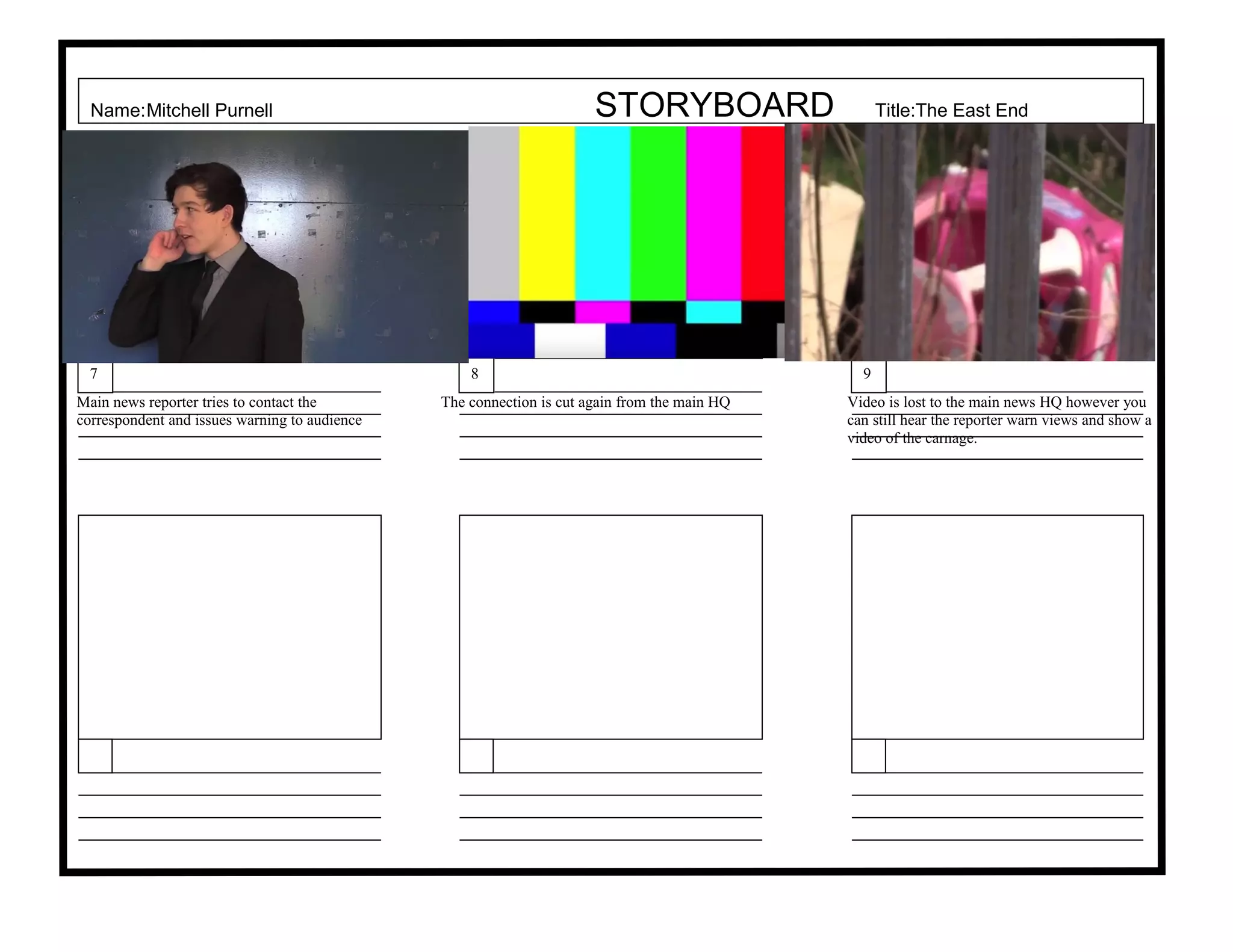 The news reporter in the East End lost video connection to main headquarters and tried to contact the correspondent to issue a warning to the audience. Although the video was lost, the reporter's audio could still be heard warning viewers and showing a video of carnage occurring. The storyboard depicts scenes 7, 8, and 9 of the news report from the East End as the connection was cut and the reporter warned audiences.