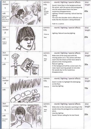 This document outlines the shots, lighting, sounds, and timing for scenes in a horror film about mysterious disappearances in the woods. It describes shots including an over-the-shoulder tracking shot of a character being followed, close-ups of a missing poster and items on the ground, and wide shots showing a character searching alone in the woods under low-key lighting. Sounds include a voiceover news report, a character calling out for their lost friend, and noises of something falling into a pond. The scenes build tension as the character finds belongings by a pond and sees ripples before fleeing in panic from the woods.