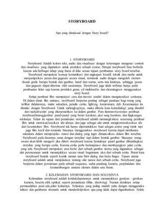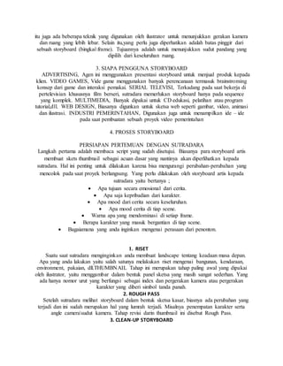 Storyboard merupakan gambaran visual dari alur cerita yang digunakan untuk merencanakan dan mengkomunikasikan ide-ide dalam produksi film, animasi, presentasi, dan konten multimedia lainnya. Storyboard terdiri atas serangkaian panel gambar dan teks yang menggambarkan karakter, latar, dan urutan peristiwa dalam cerita.
