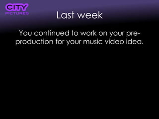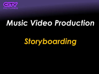 This document provides information about storyboarding for music video production. It defines a storyboard as a sequence of drawings representing the planned shots for a video production. Storyboards are created during pre-production and used by the director, cinematographer, camera operators, and lighting technicians on set to plan shots and ensure continuity. The document instructs students to begin creating a storyboard for their music video by drawing the planned shots and including relevant information like framing, camera movements, and shot descriptions.