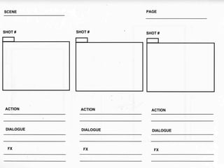 A storyboard shows a comic-book like version of a film divided into single shots and includes what characters are in each frame, how they are moving, what they are saying, how much time has passed between frames, and the camera position and movement for each shot.