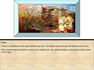 This document contains production notes for a short film. It describes various shots including establishing shots of a classroom and detention room, introductions of characters, and scenes where characters listen to music, play games, get in trouble with the teacher, and interact in detention. Technical details are provided such as using masks, motion tracking, safety mats, and cutaways to efficiently capture the scenes.