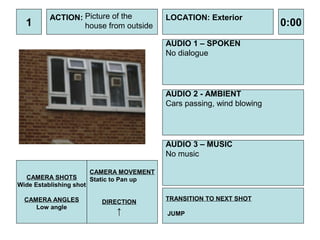 The document outlines the shots, audio, and camera movements for a scene involving the character Harry. It begins with establishing shots of the exterior and interior of Harry's house. It then shows Harry waking up, getting ready, and leaving his house. Further shots include Harry walking to the bus stop, seeing a boy he bullies, taking the bus, and arriving at college. The document continues to outline shots of Harry in his classroom, interacting with other students, and being rejected by the character Hermione after class.