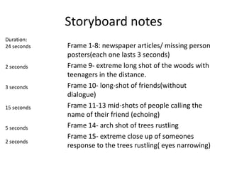 This document provides a storyboard and filming notes for a short horror film set in the woods. It includes the types of shots that will be used for different scenes, such as close-ups and long shots. It also lists the duration of each shot or sequence and details what will be depicted, such as posters searching for a missing person, characters calling out to their friend, and eventually being chased by the killer.