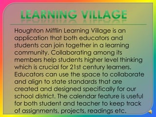The document discusses Houghton Mifflin Learning Village, an application that allows educators and students to collaborate in an online learning community. It enables teachers to align lessons to state standards, track assignments, and collaborate with other educators. For students, it provides a way to work together on projects using technology. The application aims to improve learning through collaboration and by making curriculum easily accessible from any location.
