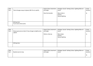The document provides details on 53 shots for a music video, describing the type of shot, camera movement/angle, setting, lighting, duration and editing notes for each shot. The shots include an artist performing, a woman in her kitchen listening and dancing to the song, and the artist traveling by car to a party. The shots are designed to tell the story of the song through these visuals.