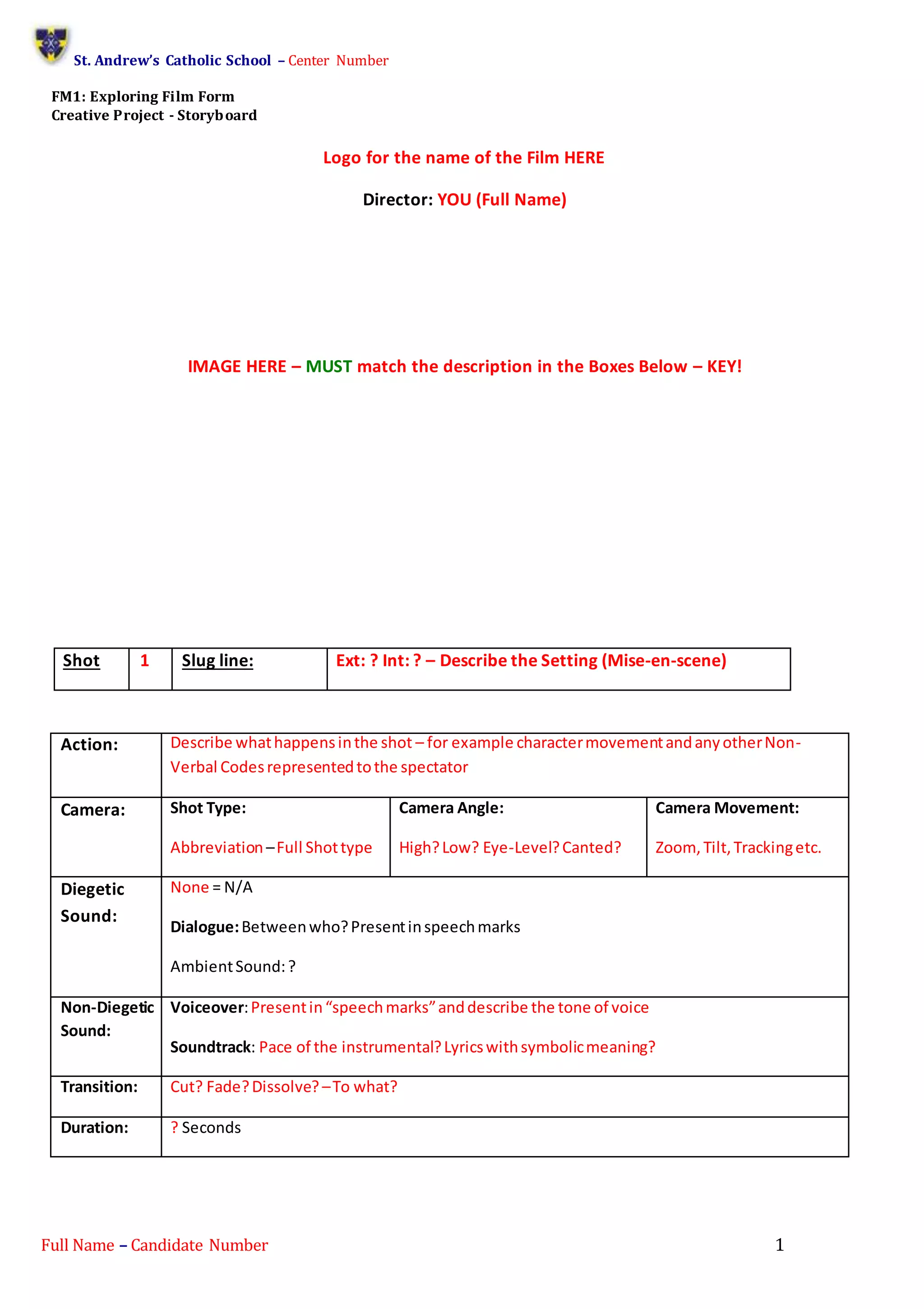 This storyboard contains details for a film, including the logo, director, and descriptions of shots including setting, action, camera specifications, sound elements, transitions between shots, and duration. It provides a visual plan for a short creative film project, outlining what will be seen and heard in each shot through written cues.