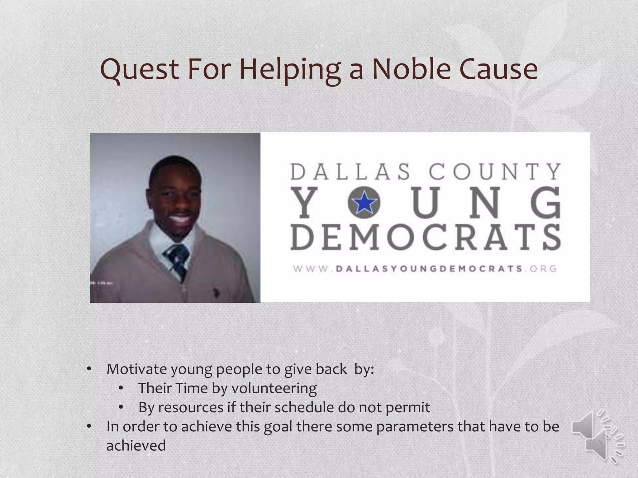 This document outlines a noble cause of motivating young people to volunteer and donate resources to help those in need locally in Dallas, Texas. It discusses the formation of Genesis Shelter for Women in 1985 which provides services like emergency shelter, counseling, and legal assistance to women and children. Current projects highlighted include adopting families for the holidays, volunteering at their benefit store, and annual fundraising golf and bowling tournaments. The document encourages donations of time and money to support Genesis' multifaceted and efficient efforts to meet the needs of the vulnerable in their community.