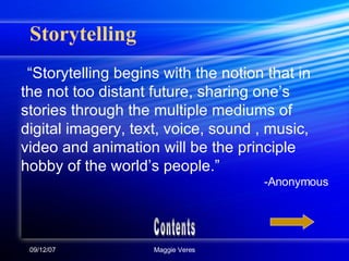 The document discusses the elements that make a good storyteller and provides tips for storytelling. It identifies seven key elements: having a point of view, asking a dramatic question, including emotional content, using your voice effectively, utilizing props, having economic pacing, and varying the pace. Additional tips include using gestures, surprise, repetition, humor, sounds, and telling true stories from your own point of view to engage the audience.