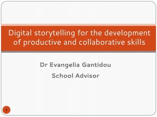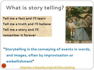 This document provides an overview of digital storytelling for educational purposes. It defines digital storytelling as conveying events through words, images, and other multimedia. The key elements of digital stories are discussed, including point of view, dramatic question, emotional content, voice, soundtrack, economy, and pacing. The document also outlines the process of creating digital stories, which typically involves writing a script, collecting assets, storyboarding, drafting, editing, and publishing the story. Digital storytelling is said to foster skills like writing, communication, collaboration, and problem solving. Examples of good practice and more sophisticated digital stories are provided.