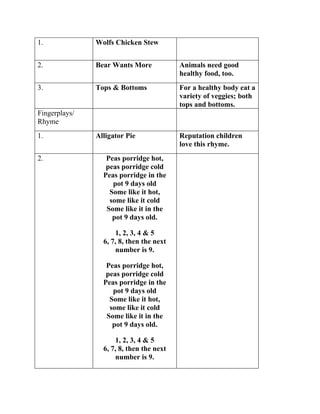 This storytime planning form summarizes a program focused on the theme of food. The opening will introduce the theme of food being important for health. Books like "Wolf's Chicken Stew" and "Bear Wants More" will teach about animals needing healthy food. A fingerplay, song, and flannelboard activity also relate to eating. The closing will remind children it is time to go home. Parents will receive a handout on daily food groups and tips on emphasizing fruits and vegetables over sugary snacks.