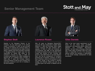 The document provides information about Stott and May, a boutique international search consultancy based in London. It introduces the senior management team of Stephen Stott, Laurence Rosen, and Giles Daniels. It then provides an overview of the company's services in key recruitment areas like executive search, technology, accounting, and telecommunications. It also describes the expertise of their finance technology practice in recruiting for fields like high-frequency trading and algorithmic trading.