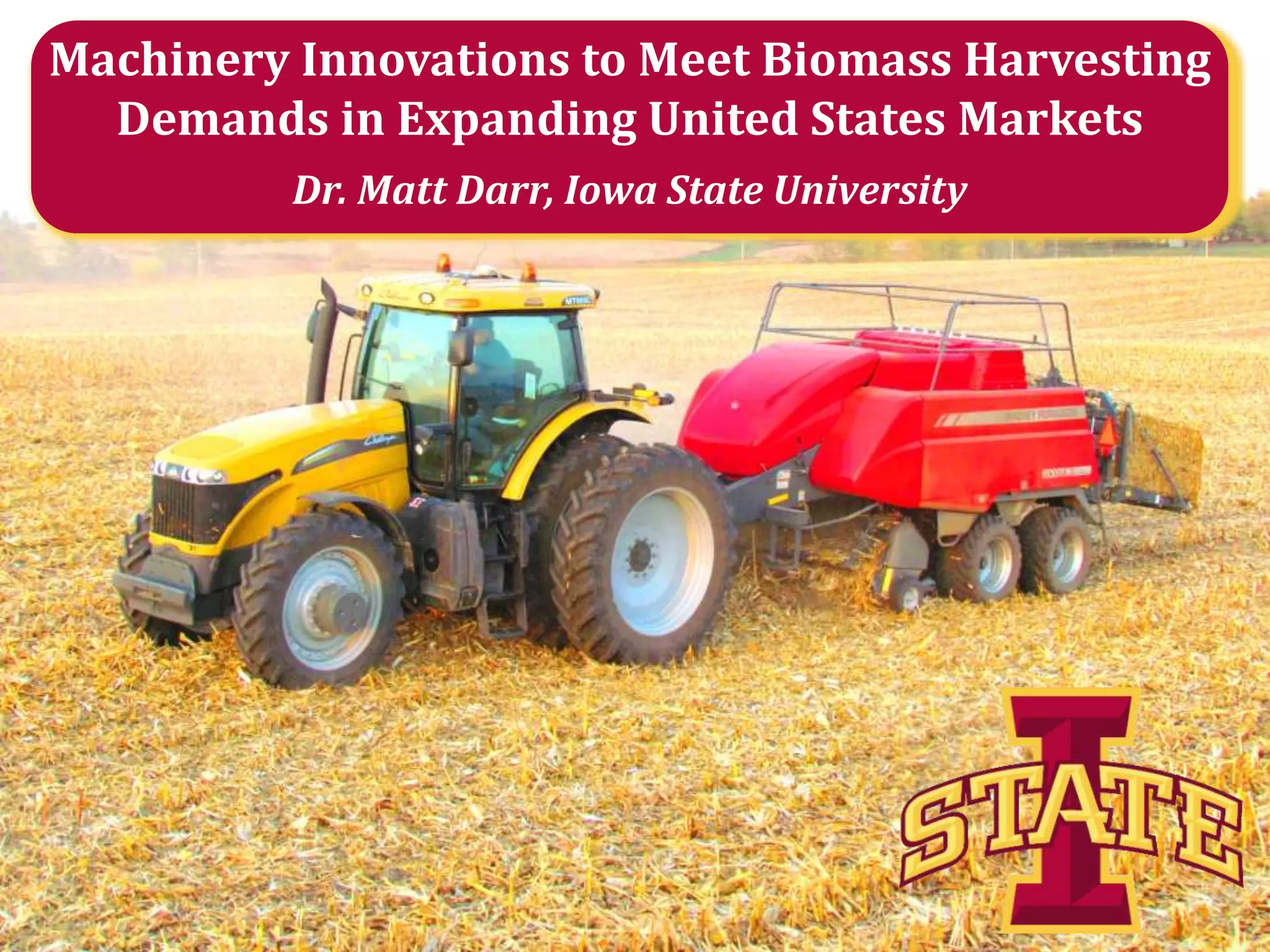 This document discusses machinery innovations needed to meet the increasing demand for biomass harvesting to support expanding biofuel markets. It summarizes Iowa State University's role in supporting the development of corn stover supply chains and biorefineries. The document outlines several innovations including increased harvest rates through baler improvements, higher density bales, single-pass harvesting machines, windrowing corn headers, and telematics to increase efficiency. It also reviews a case study on corn stover production costs and sensitivity analysis showing the largest cost factors are related to baling and feedstock supply operations. The goal is to reduce gate-delivered corn stover costs from $122 per tonne to $52 per tonne through strategies like reducing collection areas and