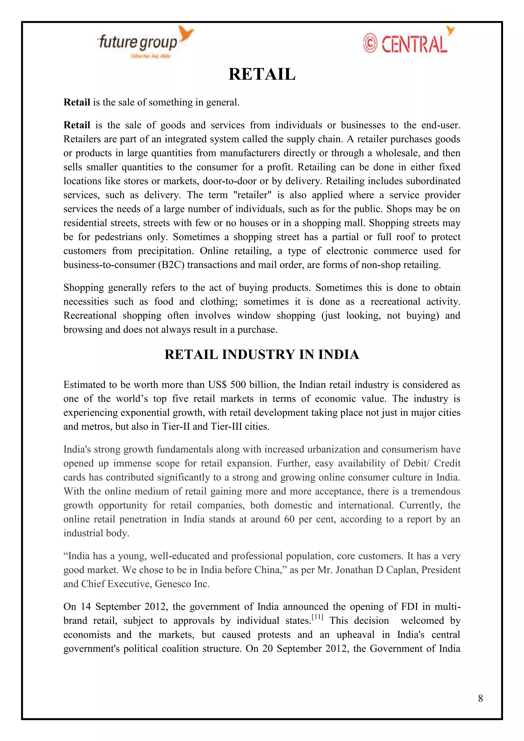 The document provides information about the retail industry in India. It begins with definitions of retail and describes various retail formats in India such as department stores, category killers, malls, discount stores, supermarkets, street vendors, hypermarkets, kiosks, mom-and-pop stores. It then discusses the size and growth of the Indian retail market and some of the major Indian and foreign retailers operating in the country. It concludes with an overview of the main segments in Indian retail in 2012 and descriptions of leading Indian retailers Future Group and Future Lifestyle Fashions.