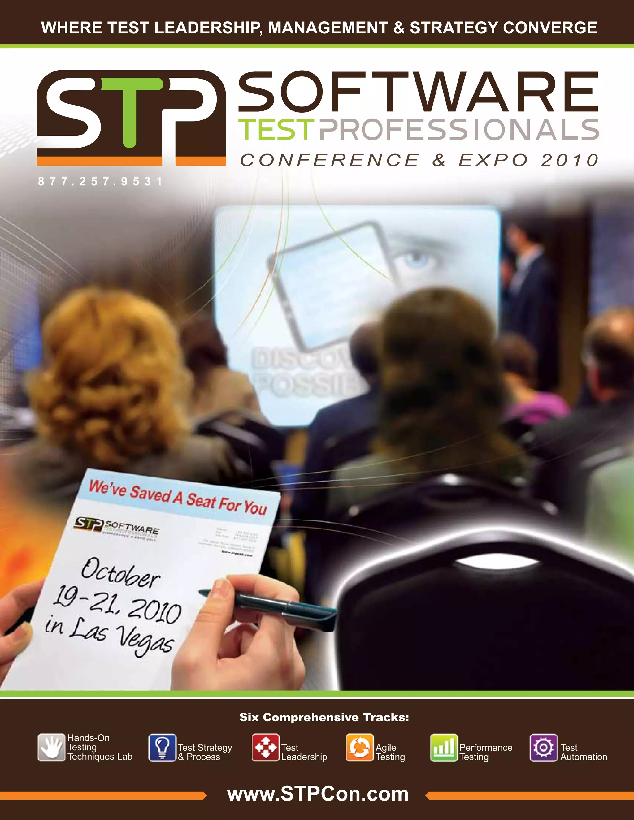This document provides information about the Software Test Professionals Conference & Expo 2010 taking place from October 19-21 in Las Vegas, Nevada. The conference will feature six comprehensive tracks covering hands-on testing techniques, test strategy and process, test leadership, agile testing, performance testing, and test automation. It will include keynote presentations, breakout sessions, a hands-on testing lab, and networking opportunities. The conference is aimed at software testers, QA managers, and other testing professionals and will provide insights and resources to enhance careers in software testing.